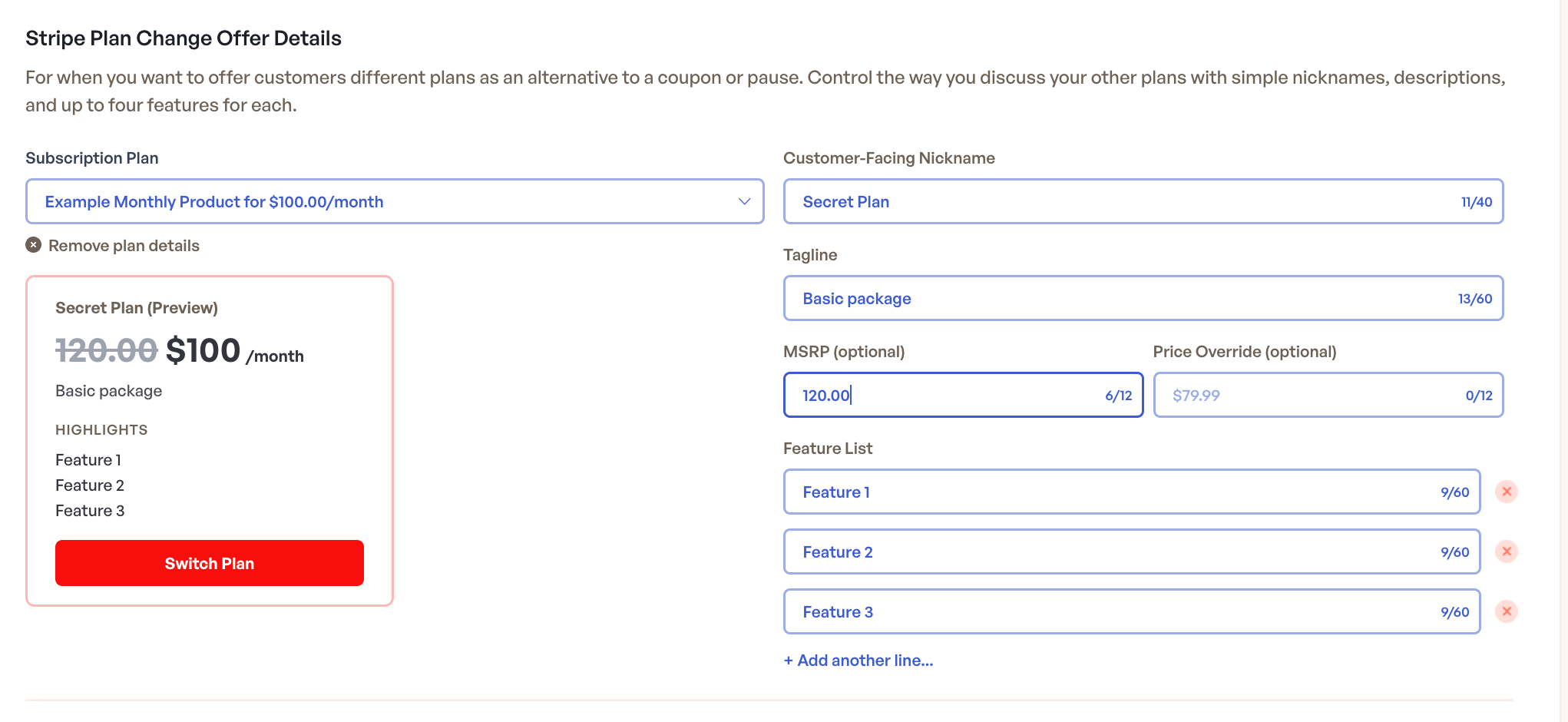 In this section, you can configure detailed presentation settings for each subscription plan that you want to offer as an alternative during cancellation flows.